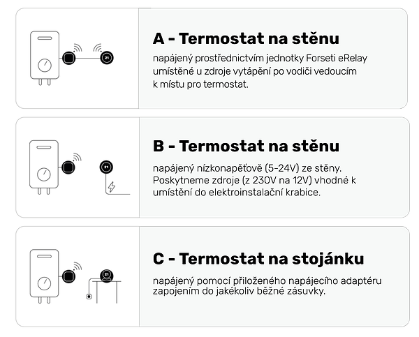 F. Dokončili jsme propojení zdroje vytápění, jednotky Forseti eRelay a termostatu Forseti eTherm. Nic dosud nepřipojujte do elektřiny a uchopte napájecí kabel k jednotce Forseti eRelay (druhý přiložený kabel, ten s koncovkou do běžné zásuvky).